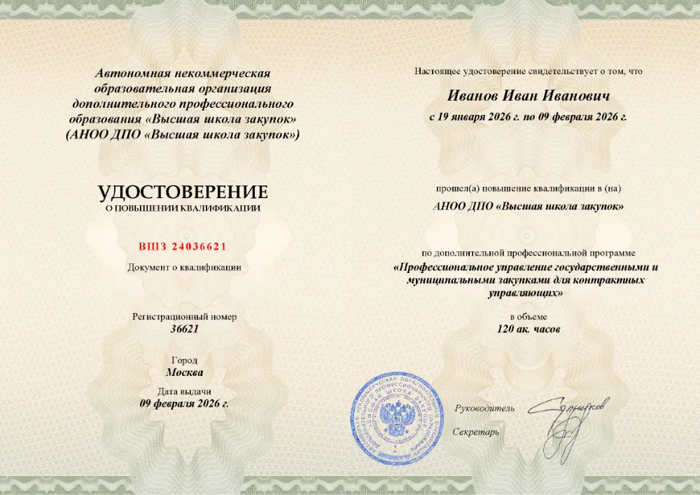 Вы получаете официальное удостоверение о повышении квалификации. Высшая школа закупок (fz44.org) обеспечивает передачу данных в реестр ФИС ФРДО, подтверждая соответствие вашей подготовки в Уфе требованиям Минтруда.